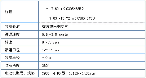 长伸缩式吹灰器主要用于吹扫锅炉再热器、过热器、省煤器等烟气温度较高区域管束表面的积灰、结焦。 吹扫周期从吹灰枪处在起始位置开始。电源接通后,电机驱动跑车沿着梁两侧的导轨前移,将吹灰枪送入锅炉内。喷咀进入炉内后,跑车开启阀门,吹灰开始。跑车继续将吹灰枪旋进锅炉,直至到前端极限后,跑车反转,引导枪管以与前进时不同的吹灰轨迹后退。当喷咀接近炉墙时,阀门关闭,吹灰停止。跑车继续后退,回到起始位置。 C305型吹灰器主要技术参数